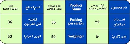 ترکیبات کیک: آرد گندم ، شکر ، تخم مرغ کامل پاستوریزه ، روغن مایع آفتابگردان، پودر کاکائو، شیر خشک کم چرب ، شربت اینورت، گلیسرین خوراکی ،گلوکز ، بکینگ پودر، نمک خوراکی تصفیه شده، سوربیتول، ژل کیک، پروپیلن گلایکول ،سوربات پتاسیم (۰٫۳۳)، لسیتین خوراکی سویا (۳۲۲)، پودر وانیلین ، اسید سیتریک ( ۳۳۰)، گوارگام، آب .