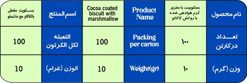 ترکیبات: آرد گندم ، شکر، روغن نباتی هیدروژنه آفتابگردان، شیر خشک بدون چربی ، گلوکز مایع ، روغن جانشین کره کاکائو، بی کربنات سدیم (۵۰۰) ،بی کربنات آمونیوم (۵۰۳)، لسیتین خوراکی سویا (۳۲۲) ، پودر ژلاتین، پودر وانیلین ، اسید سیتریک ( ۳۳۰)، طعم دهنده مشابه طبیعی، آب .