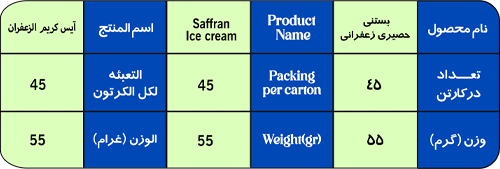 ترکیبات: شیر پاستوریزه، شکر، گلوکز، روغن نباتی هیدروژنه آفتابگردان، شیر خشک بدون چربی ،استابیلایزر، امولسیفایر، پودر زعفران .