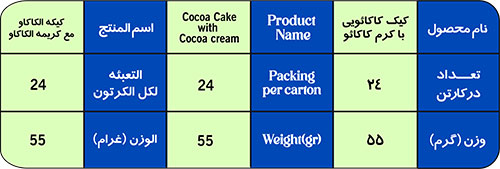 ترکیبات: آرد گندم ،شکر ، روغن مایع آفتابگردان ، روغن نباتی هیدروژنه آفتابگردان، شیر خشک کم چرب، تخم مرغ کامل پاستوریزه، شربت اینورت ، سوربیتول ، گلوکز، پودر کاکائو، لسیتین سویا (۳۲۲) ، اسید سیتریک (۳۳۰)، پیروفسفات سدیم، بیکربنات سدیم، سوربات پتاسیم (۰٫۰۳) ،مونو و دی گلیسرید، ژل کیک ،گوارگام، گلیسرین، نمک خوراکی تصفیه شده، پودر وانیلین، پروپیلن گلایکول، آب